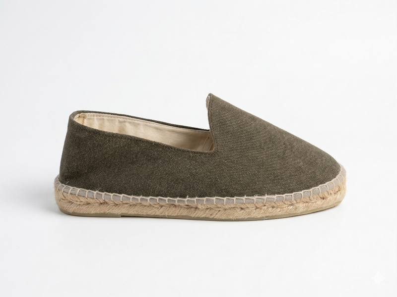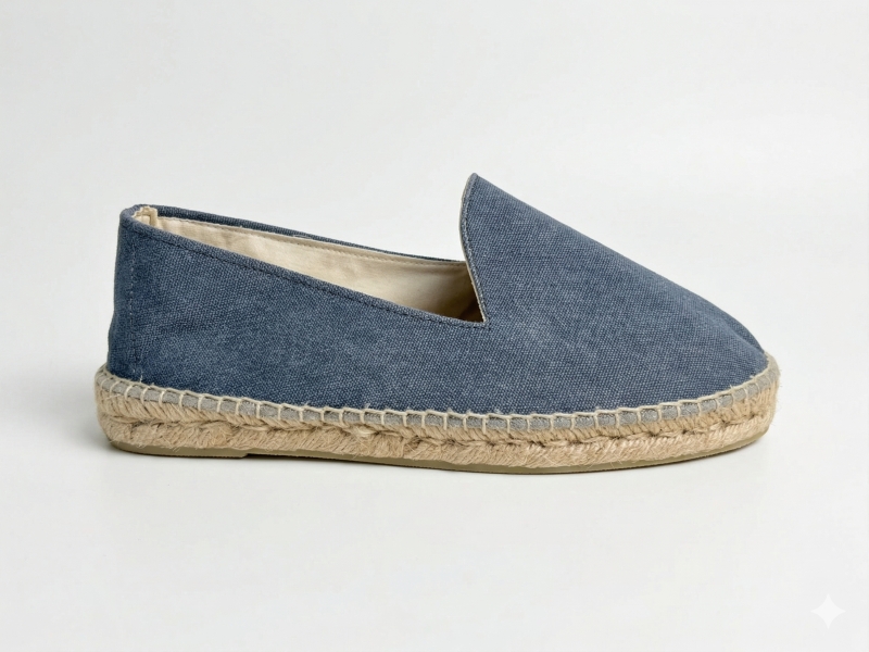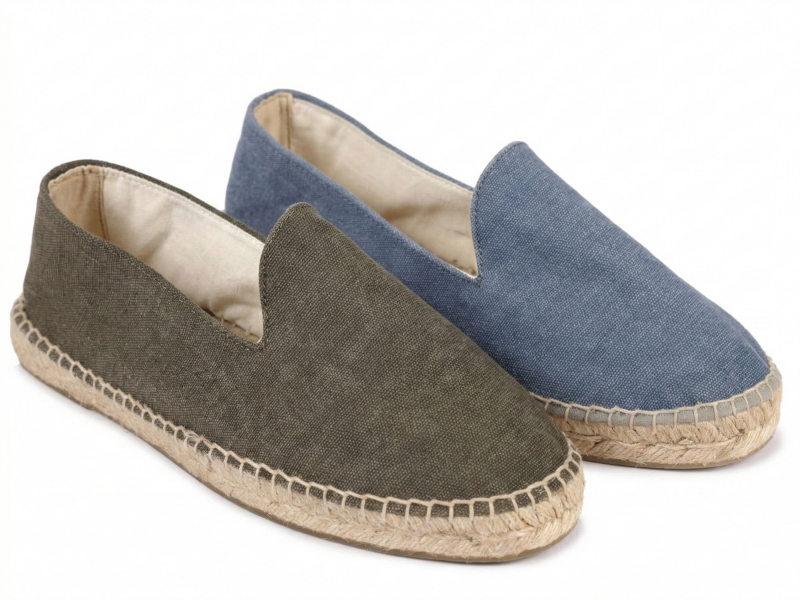 Alpargata de yute plana en lona estampada de rayas y con lengüeta o copete en el empeine. Lona con forro interior textil y talonera reforzada para mayor resistencia y comodidad. Suela recubierta de una fina capa de caucho antideslizante para alargar la duración del yute y mejorar la adherencia.